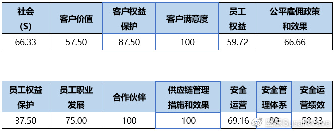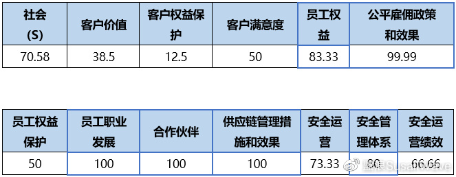 但在社会方面的表现高于交通运输行业的49分,其中在员工职业发展、合作伙伴、供应链管理措施、社区能力建设拿到满分,公平雇佣政策和效果、客户权益保护、员工权益、安全管理体系也表现良好,但是在客户价值、客户权益保护方面分数较低。