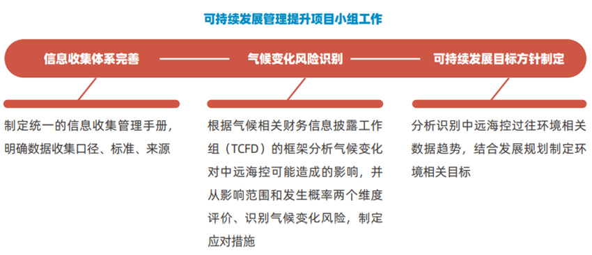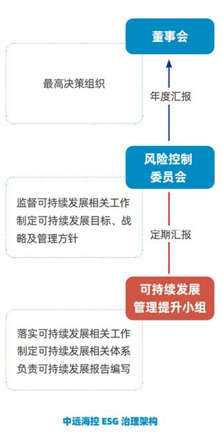 为践行可持续发展方针,中远海控成立可持续发展管理提升项目小组,协助风险委员会具体落实并完善可持续发展相关工作。可持续发展管理提升项目小组负责全面开展可持续发展相关事宜,包括协助完善可持续发展信息收集体系、分析并识别气候变化风险、制定可持续发展目标方针等。可持续发展管理提升项目小组向风险控制委员会汇报工作进展与结果,并由风险控制委员会向董事会进行年度报告,以完善从下至上的沟通机制。在风险内控、风险管理体系指标上,中远海控得分皆为100。
