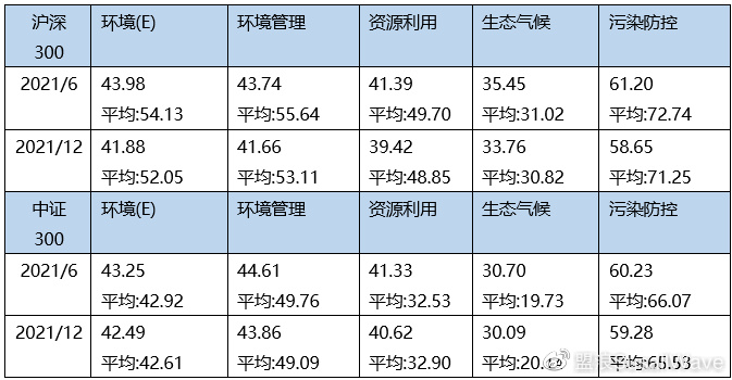 而在中证800中,除了资源利用和生态气候稍高于平均,其他皆低于平均;并且不论是在沪深300还是中证800,环境类各项评分从2021年6月到12月都呈现下降趋势,值得关注。