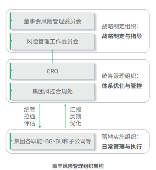 顺丰搭建了由董事会风险管理委员会领导的风险管理组织架构。董事会风险管理委员会下设风险管理工作委员会,负责制定风险 管理战略,统筹公司重大风险的预防、管控和应对。风险管理工作委员会每季度、年度向董事会风险管理委员会进行汇报。集团首席风控官(CRO)负责落实集团风险管理战略,指导和评估各职能、BG、BU和地区的风控机制建立与完善。在风险管理体系指标上,顺丰控股得分为100。