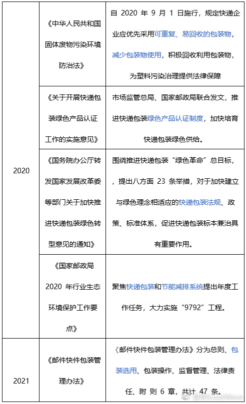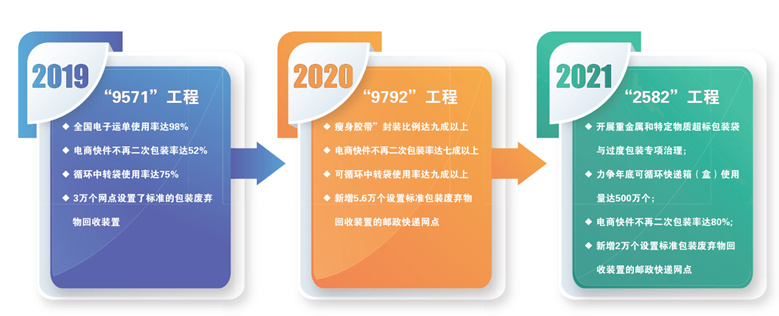 为促进行业健康发展,相关部门推动一系列标准和政策意见,并以“绿色化、减量化、可循环”为目标,聚焦寄递环节快递包装,邮政快递业接续实施“9571”、“9792”、 “2582”工程,快递包装绿色治理呈现明显变化。