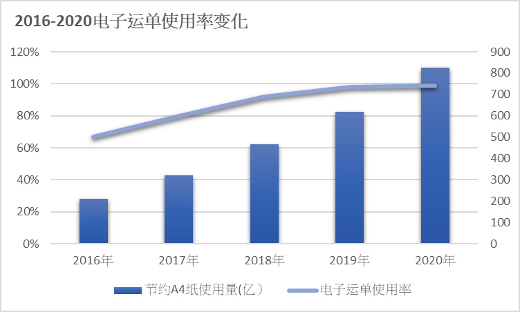 据国家邮政局数据显示,2020年时电子运单普及率已达99%,节约耗用纸量约相当于 825.3 亿张 A4 纸,少砍伐 252.2 万棵大树,节约 3,603 立方米的水。在节约的同时,也提高了效率。