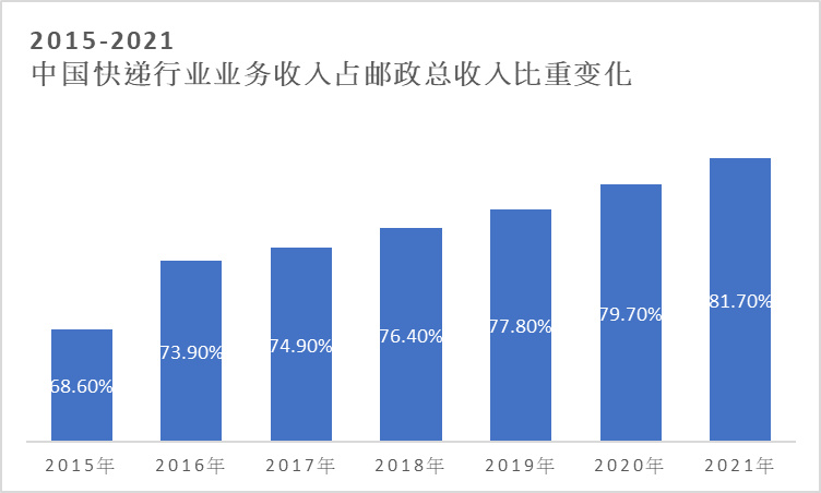 2015-2021年,我国国内快递业务收入占邮政业总收入的比重整体保持逐年上升趋势。2021年全国快递行业收入占邮政业收入的比重为81.7%,全年快递业务收入10,332.3亿元,增长17.5%,反映国内快递业务是邮政行业的主要业务来源,因此快递行业实现ESG在邮政行业中尤为重要。