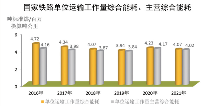 2021年,国家铁路能源消耗折算标准煤1580.74万吨,比2020年增加85.86万吨, 增长5.7%。单位运输工作量综合能耗4.07吨标准煤/百万换算吨公里,比2020年下降3.9%。单位运输工作量主营综合能耗4.02吨标准煤/百万换算吨公里,比2020年减少3.5%。