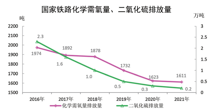 而从主要污染物排放量来看,2021年国家铁路化学需氧量排放量为1611吨,比上一年减少12吨;二氧化硫排放量0.2万吨,比上一年减少0.1万吨。