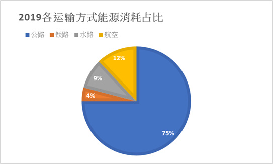 公路交通所产生的碳排放在2019年占交通领域碳排放总量的74%,航空、船舶和铁路交通产生的碳排放量较小。而建立交通设施本身伴随高资源消耗和高环境污染,其中2019的运输能源消耗占比也以公路为最多,占75%。