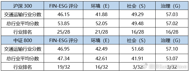根据盟浪的FIN-ESG模型最新一期的评级评分结果,在沪深300及中证800的行业中,交通行业的FIN-ESG评分皆低于所有行业平均,得分在46-47左右。在沪深300的行业得分排名中尤其靠后,29个行业中排第25名。