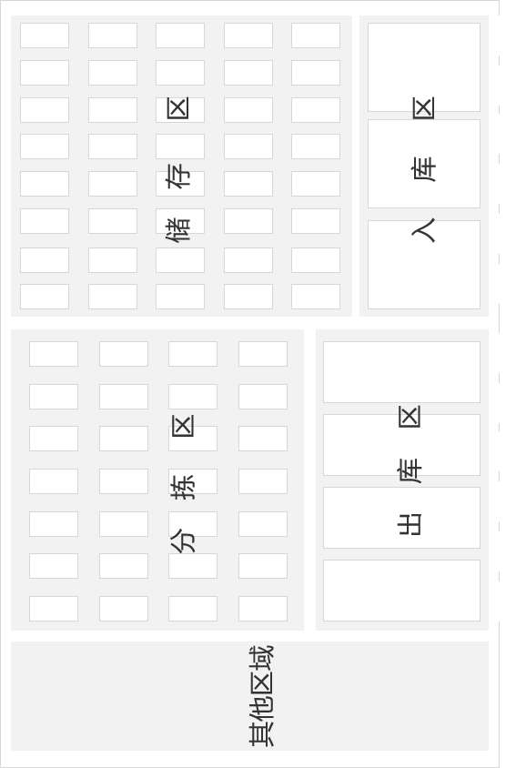 入库区:接受外来货物,交接检验货物情况储存区:储存货物的区域分拣区:按照订单进行分拣的区域出库区:根据订单进行打包,快递单打印,分包操作的区域其他区域:仓库配套的其他行政区域