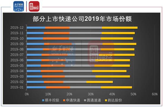 图4:部分上市快递公司2019年业务单量超额增速截至2019年12月底,顺丰控股、申通快递、圆通速递和韵达股份四家头部企业的市场占有率分别为7.62%、11.60%、14.35%和15.79%,合计达49.36%。其中,顺丰控股市占率与2018年同期持平,韵达股份市占率提高了2.02个百分点,申通快递市占率提高了1.52个百分点,圆通速递市占率提高了1.21个百分点。
