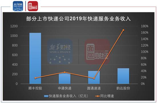 图5:部分上市快递公司2019年市场份额 快递收入增长,单票收入承压 随着业务单量的提升,公司相应的收入也在提高。2019年,顺丰控股、申通快递、圆通速递和韵达股份的快递服务业务收入分别为1061.43亿元、226.8亿元、269.3亿元和323.4亿元。其中,收入增幅最大的为韵达股份,同比增涨168.34%。