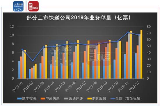 图1:部分物流行业上市公司2019年业绩预告情况另外,还有3家公司业绩预减,4家公司预计亏损。其中,德邦股份(15.620, -0.47, -2.92%)预计归母净利润为2.45亿元~3.85亿元,同比下降45%~65%。根据公告,公司业绩预减主要是由于公司产品价格策略调整以及持续的资源投入,致使主营业务毛利率有所下滑。新宁物流(3.920, -0.04, -1.01%)、华鹏飞(4.500, -0.02, -0.44%)、*ST飞马(2.220, -0.01, -0.45%)(维权)和上海雅仕(14.890, 0.10, 0.68%)预计2019年均有较大规模亏损。根据公告,业绩爆雷的原因普遍在于商誉减值以及应收账款减值,行业内相关风险值得关注。 顺丰控股(54.470, -0.95, -1.71%)业务单量增速第四季度持续领跑,格局将变?上市快递公司中,顺丰控股、申通快递(10.750, -0.10, -0.92%)、圆通速递(16.990, -0.16, -0.93%)和韵达股份(11.900, -0.35, -2.86%)2019年的业务单量分别为48.41亿票、73.70亿票、91.15亿票和100.30亿票,分别同比增长25.12%、44.17%、36.83%和43.59%。从平均单月的表现来看,韵达股份、圆通速递和申通快递分别达8.36亿票/月、7.6亿票/月和6.14亿票/月,顺丰控股业务单量仅4.03亿票/月,与“二通一达”有着较大差距。