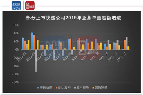 图2:部分上市快递公司2019年业务单量2019年业务单量增速显示,在第一季度和第二季度期间,申通快递和韵达股份以非常接近的业务量增速领跑,增长率基本都维持在40%以上;第三季度开始,“二通一达”的业务量增速有放缓趋势,而顺丰控股的业务单量增长持续提速;第四季度期间,顺丰控股业务量增速超过其他三家,连续三个月领跑。从2019年12月份数据来看,业务量增速排名为:顺丰控股(57.84%)>韵达股份(48.61%)>圆通速递(32.15%)>申通快递(26.09%)。