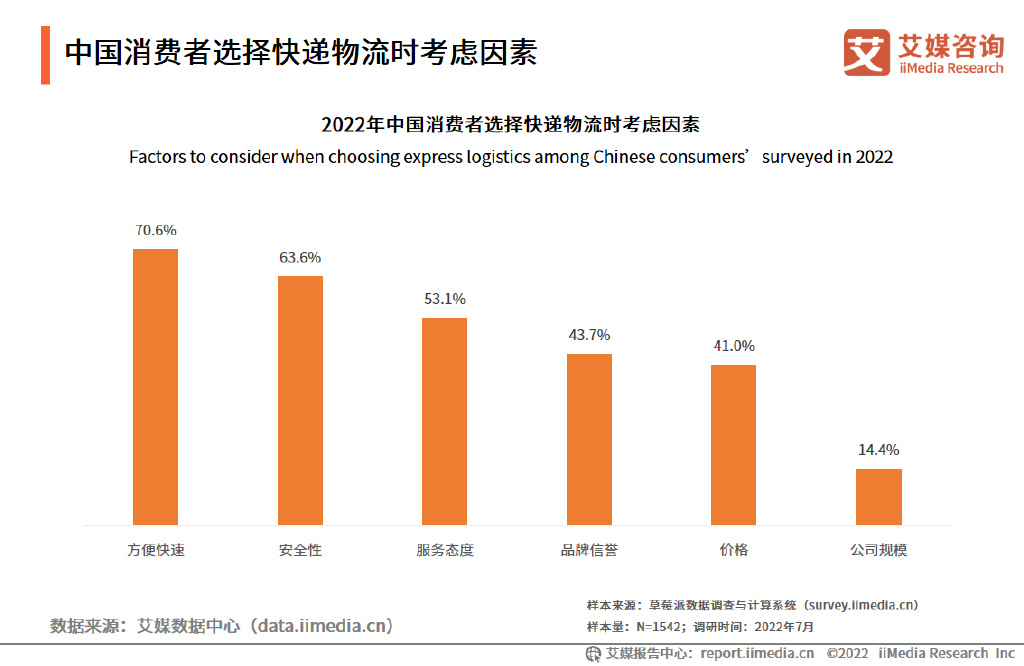 数据显示,在选择快递物流时,超过7成的用户首先考虑方便和速度,其次才是安全性、服务态度、品牌信誉和价格等因素。而考虑公司规模仅占14.4%。