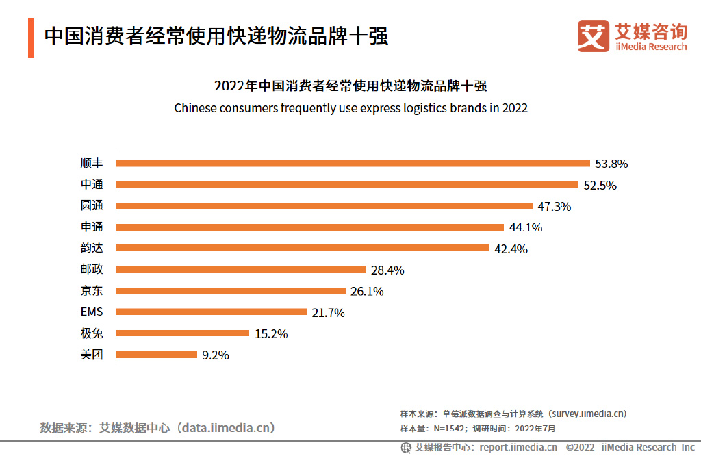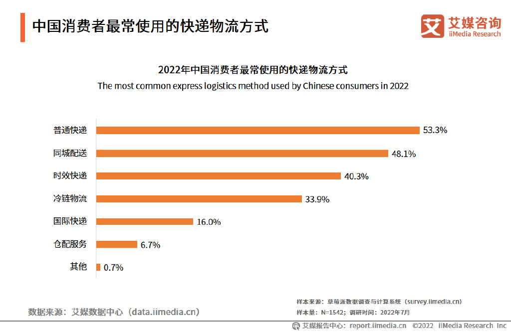数据显示,2022年中国消费者最常使用快递物流方式是普通快递,占比为53.3%;其次是同城配送和时效快递,占比为48.1%和40.3%。