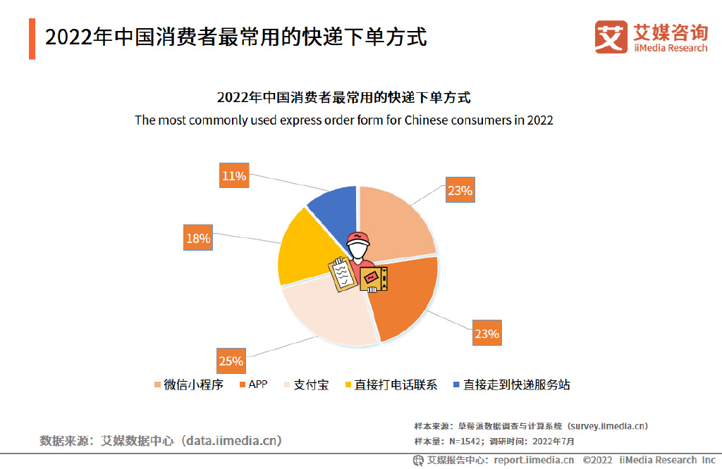 数据显示,2022年中国消费者最常用快递下单方式,占比最多的是微信小程序,占比分别为25%;其次是快递APP和支付宝,占比均为23%。直接去快递服务站下单的占比最少,仅为11%。