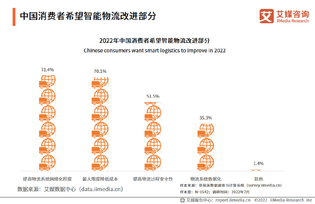 数据显示,2022年中国消费者希望智能物流能够提高物流系统网络化程度,占比为71.4%。艾媒咨询分析师认为,中国物流网络化程度时效性程度依旧较低,不能精准反馈给客户快递物流所在地点与到达时间。其次是最大限度降低成本,占比为70.1%。
