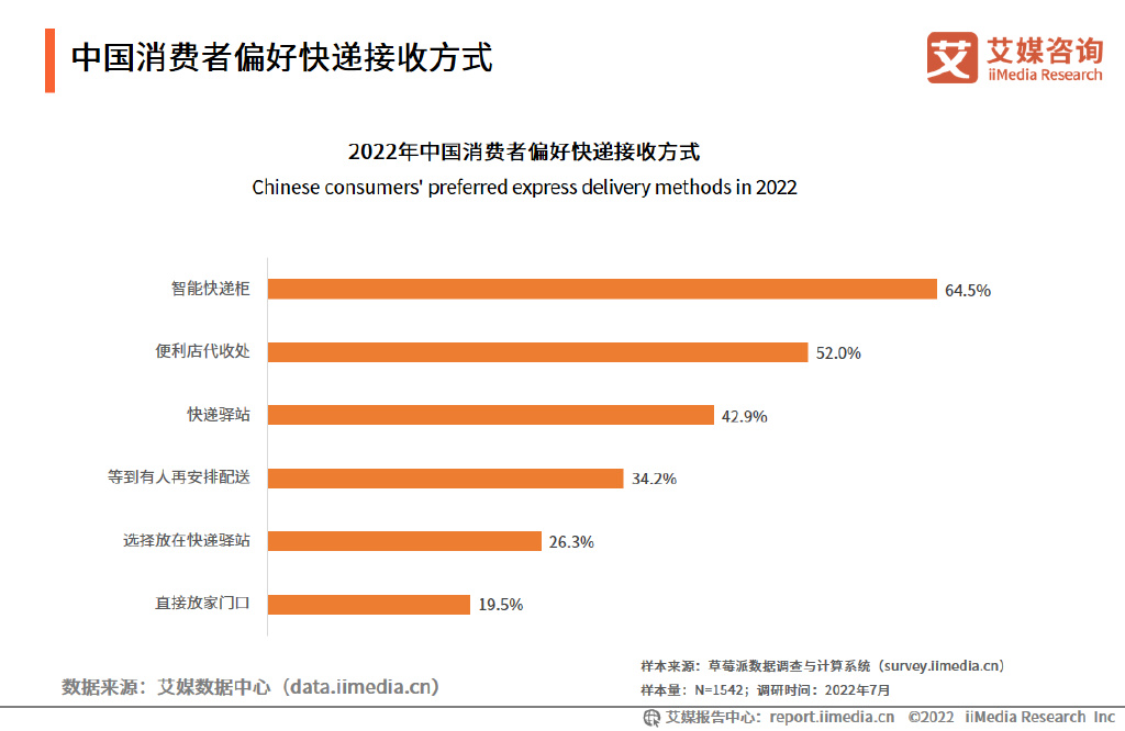 数据显示,64.5%的受访者会更偏向于选择将快递放在智能快递柜;其次,选择放在便利店代收处和快递驿站的用户分别占52.0%和42.9%。艾媒咨询分析师认为,这表明更多的用户偏向于让快递被“代签收”,这种代签收的方式更能节省时间、提高效率。随着电商及网络购物的发展,快递代签收的方式在未来将被长期使用,智能快递柜是重点发展方向。