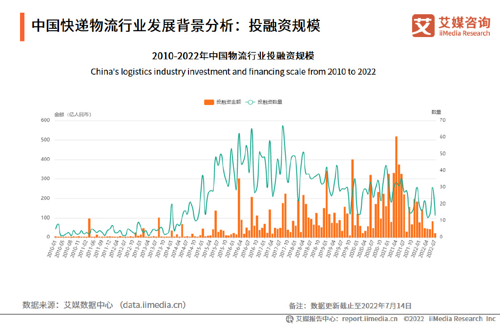 数据显示,2022年上半年,中国物流行业投融资规模在2月份达到最高金额,为132.16亿,投融资数量最多的是6月份,数量为21个。