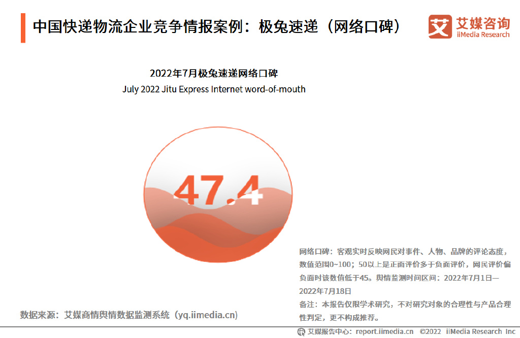 艾媒商情舆情数据监测系统显示,极兔速递网络口碑为47.4,网络评价负面为主。艾媒咨询分析师认为,这与极兔速递前期极速扩张市场份额,但后期售后服务培训没有跟上导致的。