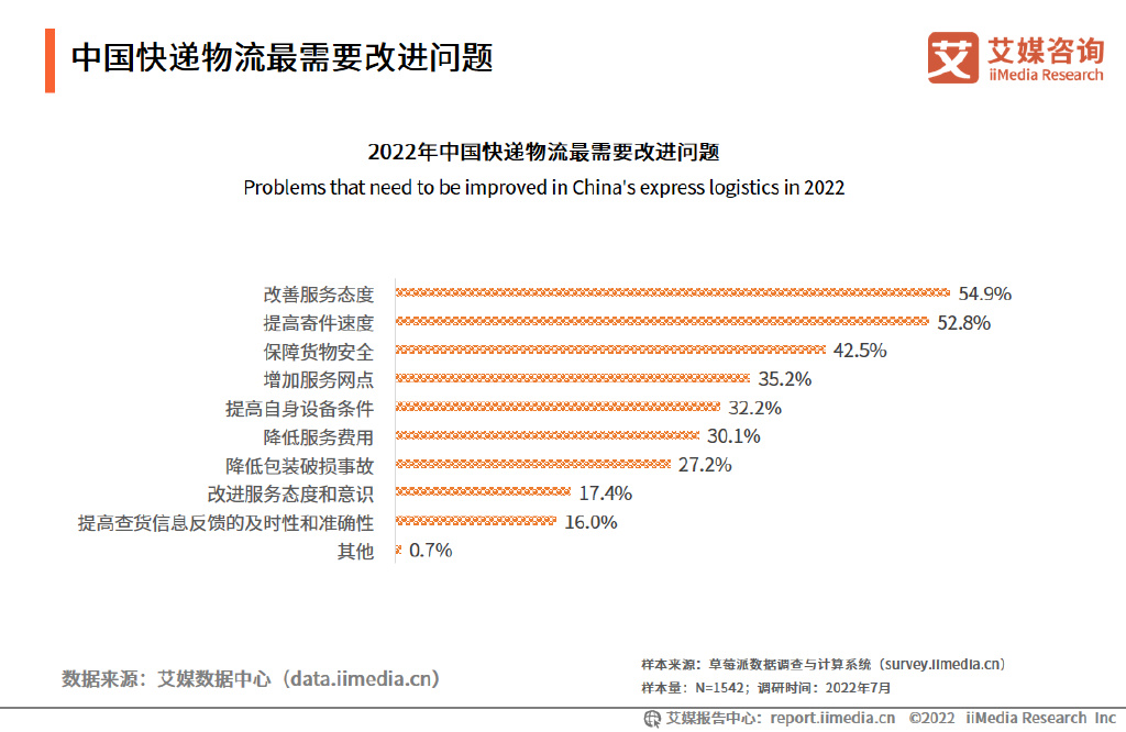 数据显示,有54.9%的消费者认为中国快递物流的服务态度需要改善;其次是提高邮寄件的速度,占比为52.8%。而保障货物安全和增加服务网点占比分别为42.5%和35.2%。降低服务费用反而出乎意料的未进前5,仅位居第6。艾媒咨询分析师认为,许多快递公司一味强调供应链的完善,却忽视了员工的素质培训,这也导致“改善服务态度”成为中国快递物流需要改进的问题。