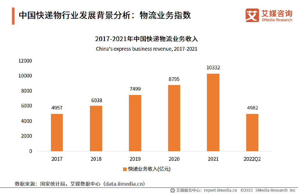 2021 年,全国快递业务收入完成 10332亿元,同比增长 17.5%。市场规模扩大的同时,竞争仍然激烈。截至2022年第二季度,共达4982亿元。