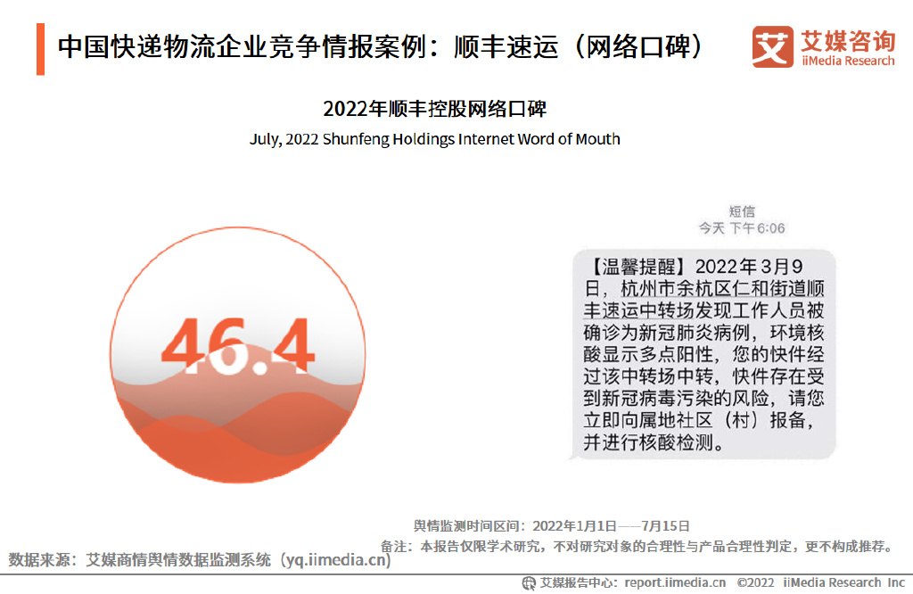 艾媒商情舆情数据监测系统显示,2022年7月,顺丰控股的网络口碑仅有46.4,偏负面。艾媒咨询分析师认为,负面问题主要集中在顺丰事件上,指顺丰没有重视防疫工作导致疫情扩散。